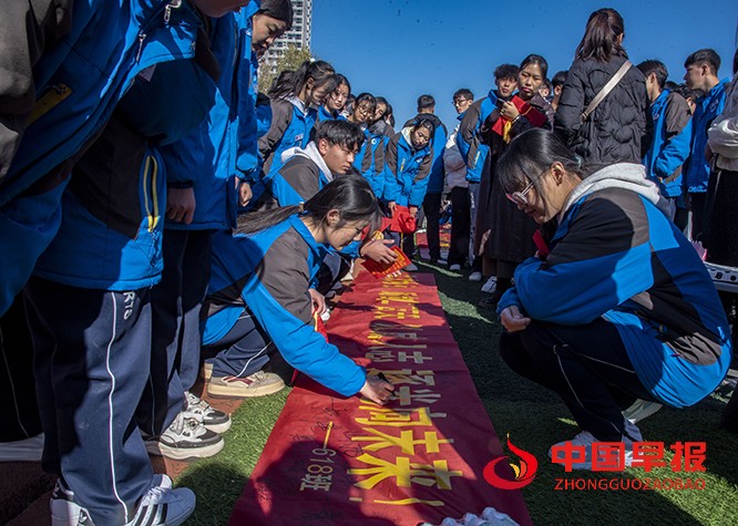 仪式现场温情与激昂交织。学子们在家长的陪伴下缓缓迈过“成人门”,标志着从青涩少年向责任公民的蜕变。父母亲手为孩子佩戴冠徽,两两相对诵读家书,字里行间满含期许与牵挂,温情瞬间浸润全场。拜师礼环节,学子们向师长行感恩之礼,师生互敬互勉,传承尊师重道的优良传统。随后,千余名学子高举右拳庄严宣誓,铮铮誓言响彻校园;他们将理想大学的名字郑重书写在班级条幅上,以青春之名立下冲刺高考的坚定誓言,正式吹响 200 天倒计时的奋进号角。