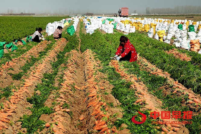 中国早报 河南讯(特约记者 李新义)12月7日,冬日暖阳洒满田间,河南省开封市尉氏县张市镇张市村特色种植合作社的员工们正忙碌在红萝卜种植园里。大家分工协作、抢抓农时,采收、分拣、打包一气呵成,新鲜的红萝卜将源源不断发往外地市场。