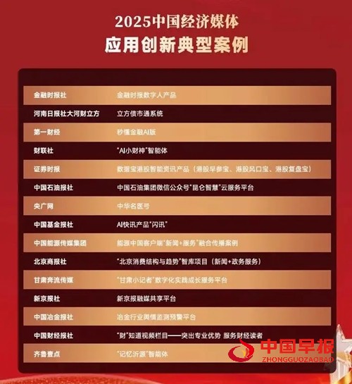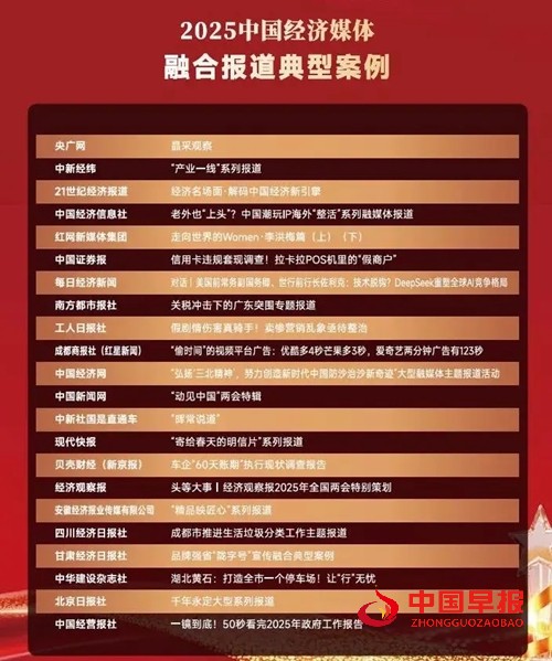 经过专家评审委员会评选,获评“2025中国经济媒体融合报道典型案例”的新闻单位分别是:央广网、中新经纬、21世纪经济报道、中国经济信息社、湖南红网新媒体集团、中国证券报、每日经济新闻、南方都市报社、工人日报社、成都商报社(红星新闻)、中国经济网、中国新闻网、中新社国是直通车、现代快报、贝壳财经(新京报)、经济观察报、安徽经济报业传媒有限公司、四川经济日报社、甘肃经济日报社、中华建设杂志社、北京日报社、中国经营报社。