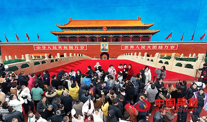 中国早报 河南讯(特约记者 李新义)1月1日,河南商丘市睢阳区闫集镇吴营村热闹非凡,一幅巨型 “天安门” 墙绘前挤满了慕名打卡的游客。